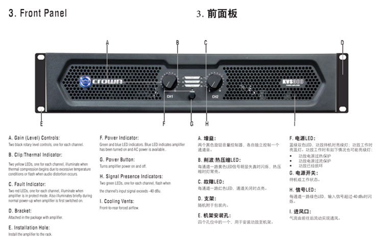 性能全面的Crown KVS 系列功放擁有卓越的可靠性與穩(wěn)定性,該系列共有4個(gè)型號(hào):KVS300 / KVS500 / KVS700 / KVS1000,其輸出功率的覆蓋范圍從2*300W至2*1000W,能夠完全勝任如KTV等娛樂場(chǎng)所的應(yīng)用。