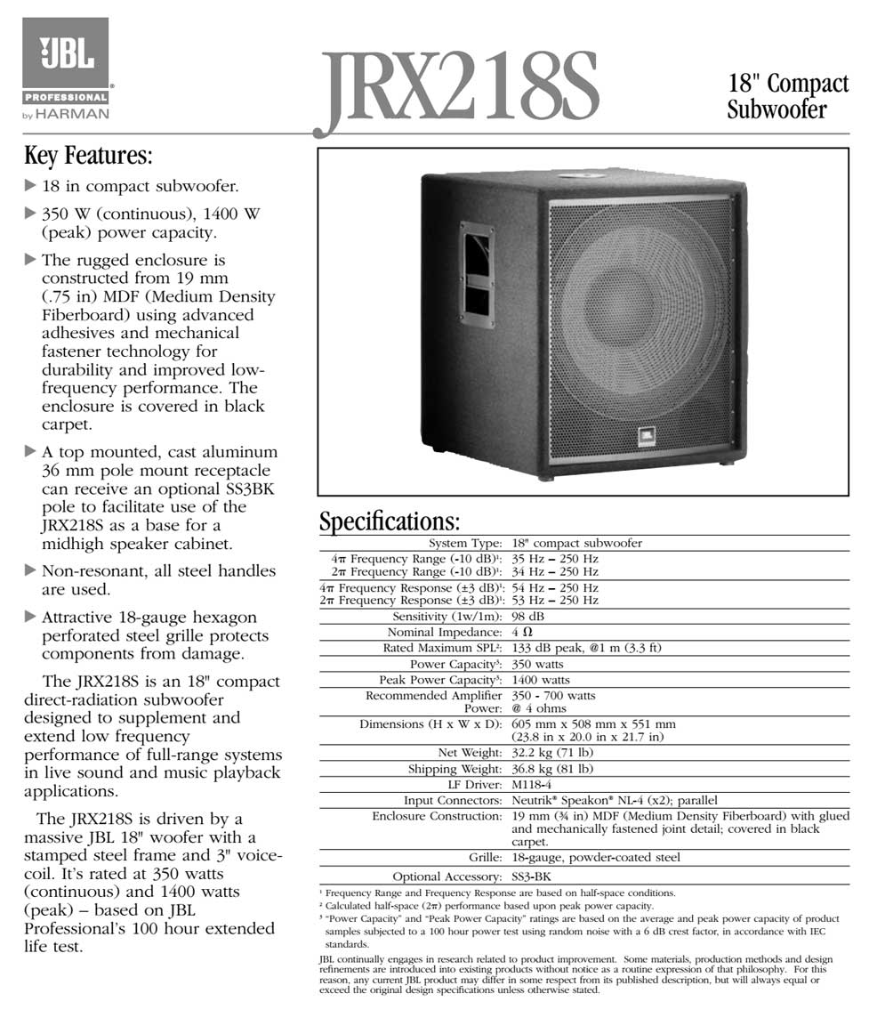 JBL jrx218s 18英寸低音音箱 舞臺 會議 演出 音響 專業揚聲器 會議培訓演出音響系統工程 擴聲系統 jbl專業音響 家庭卡拉OK 包房音響。先進的 PT 波導設計只是 JBL 創新的-個例子。 十年來,號筒設計師們杰出地處理了覆蓋角控制、 低失真和良好的頻率響應特性三者之間的關系。JBL 開發了自有知識產權的算法,這種算法使 PT 波導在所有場所都具有好的使用性能。