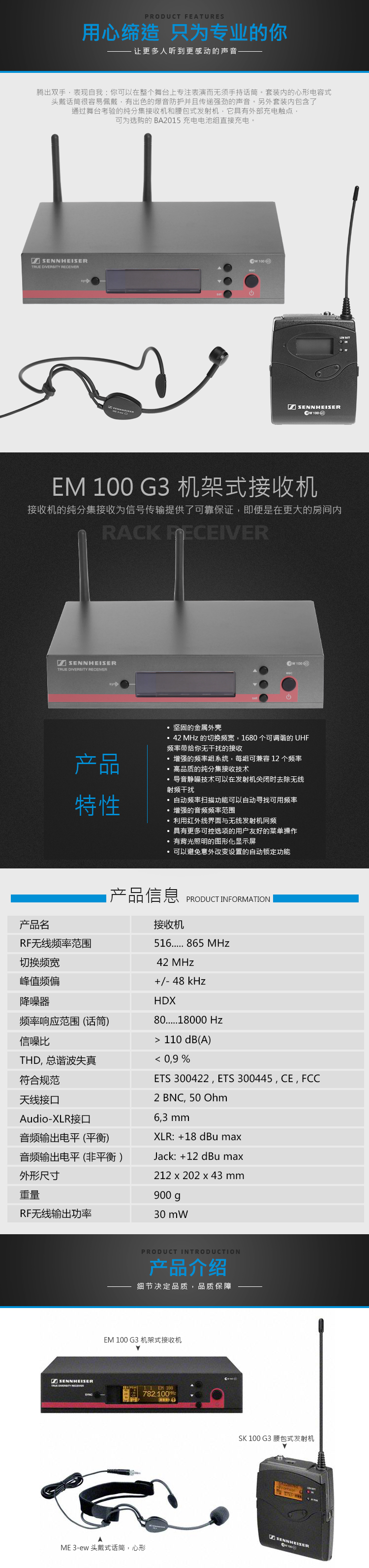 騰出雙手,表現自我:你可以在整個舞臺上專注表演而無須手持話筒。套裝內的心形電容式頭戴話筒很容易佩戴,有出色的爆音防護并且傳遞強勁的聲音。另外套裝內包含了通過舞臺考驗的純分集接收機和腰包式發射機,它具有外部充電觸點,可為選購的BA2015 充電電池組直接充電。 特點 堅固的金屬外殼 42 MHz 的切換頻寬,1680個可調諧的UHF頻率帶給你無干擾的接收 增強的頻率組系統,每組最多12個兼容頻率 高品質的純分集接收技術 導音靜噪技術可以在發射機關閉時去除無線射頻干擾